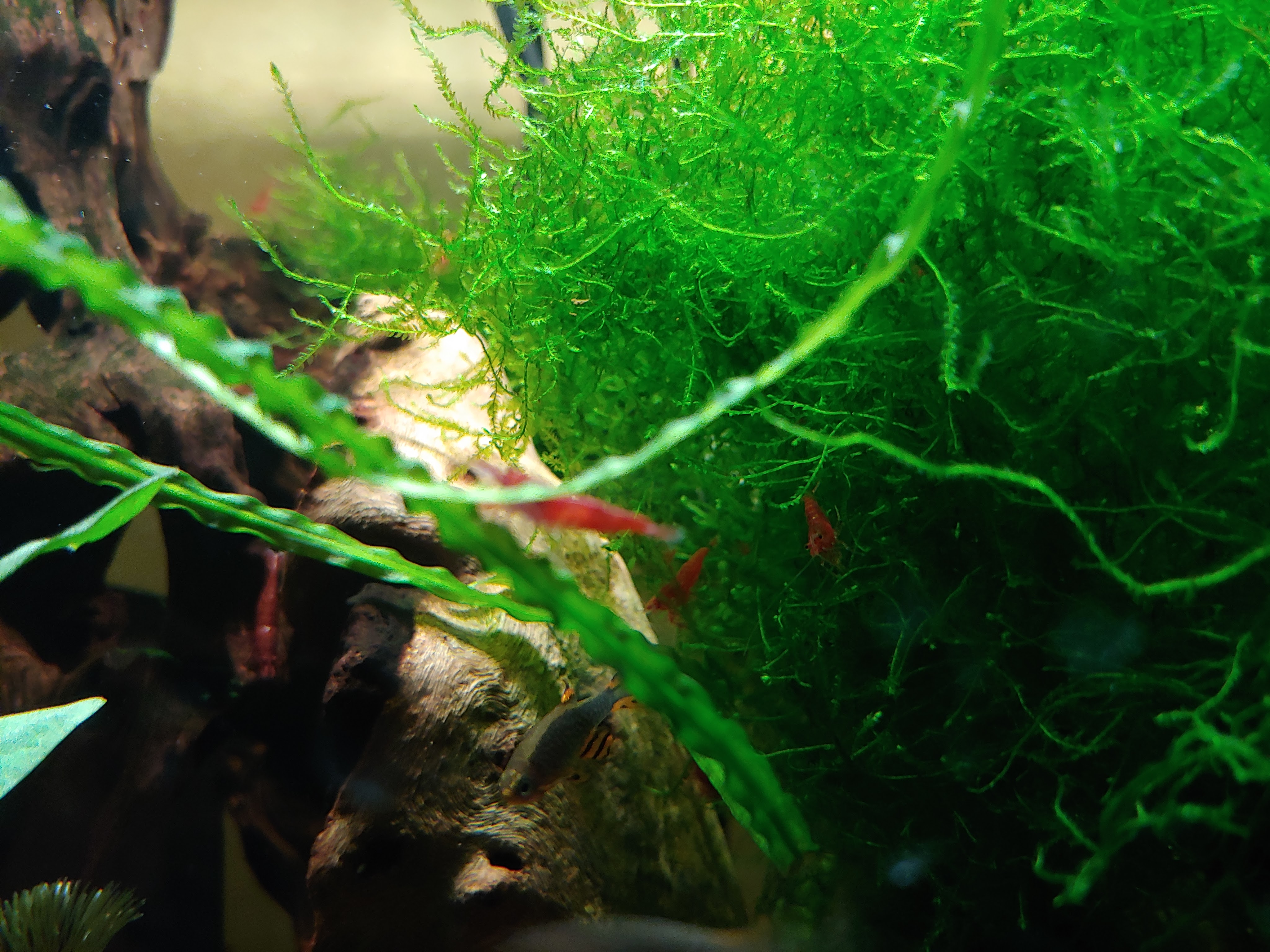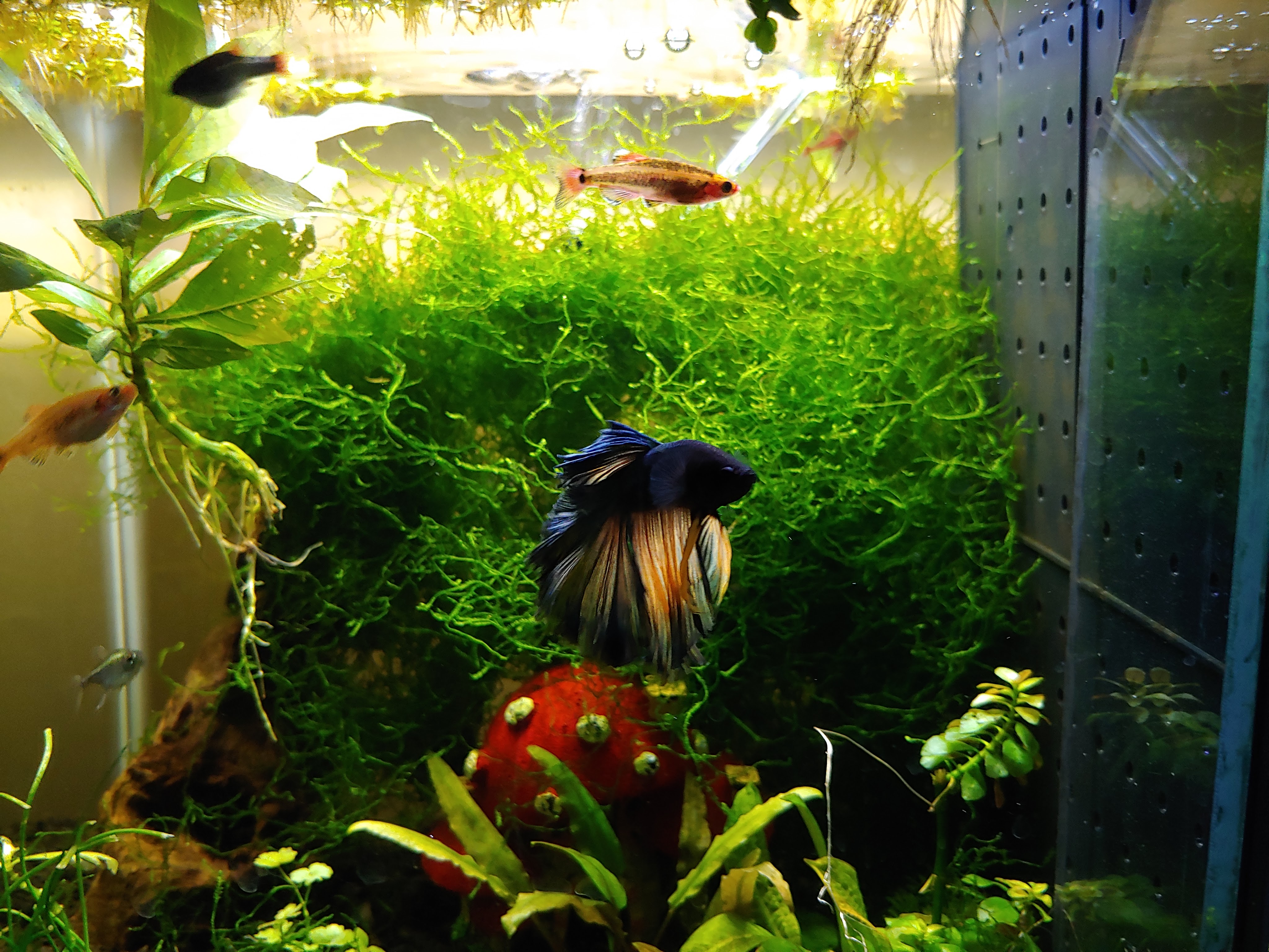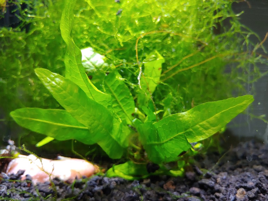 While Java Moss can be slow growing, I have found no better plant for absorbing extra nutrients and making my aquariums more stable. Java Moss tends to grow in a more bunchy style and provides not only a beautiful shade of green, but also an excellent hiding spot for my more timid species. My shrimp hang out in the moss first, as it catches the floating detritus that they love to eat, my celestial pearl danios lay their eggs in the moss for protection, my bettas use it as a resting place, and my guppy fry hide in it.